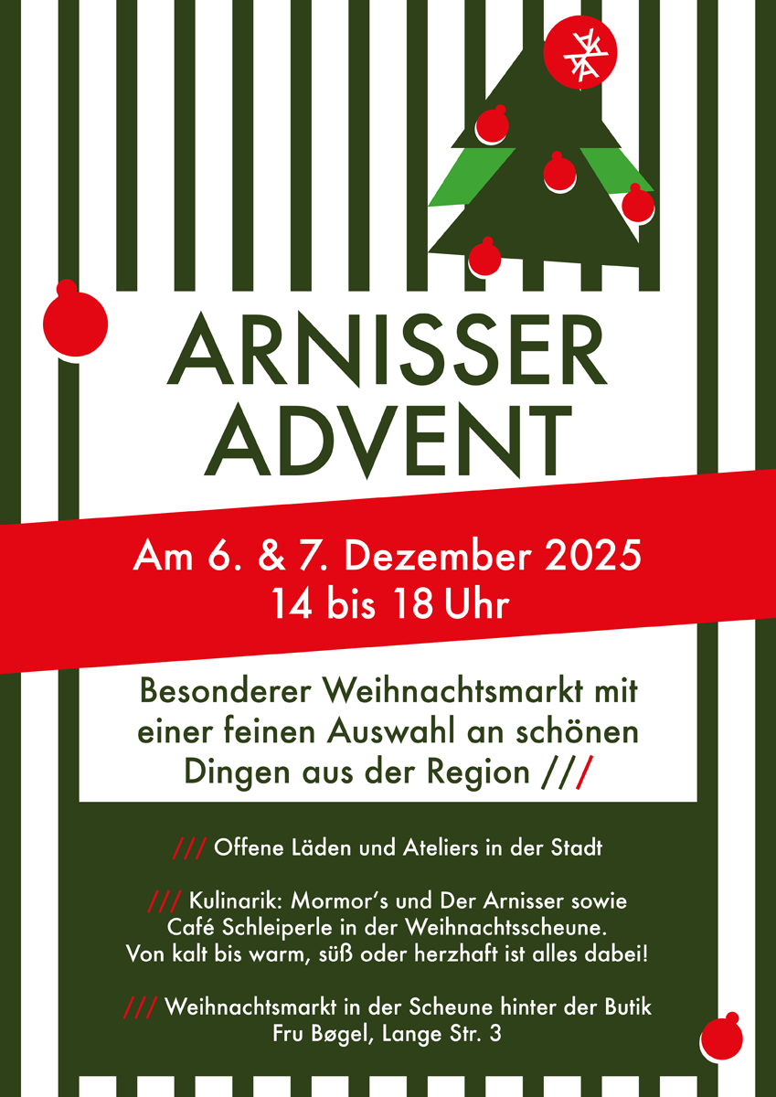 6. & 7. Dezember 2025 14 bis 18 Uhr Besonderer Weihnachtsmarkt mit einer feinen Auswahl an schönen Dingen aus der Region. /// Offene Läden und Ateliers in der Stadt /// Kulinarik: Mormor‘s und Der Arnisser sowie Café Schleiperle in der Weihnachtsscheune. Von kalt bis warm, süß oder herzhaft ist alles dabei! /// Weihnachtsmarkt in der…