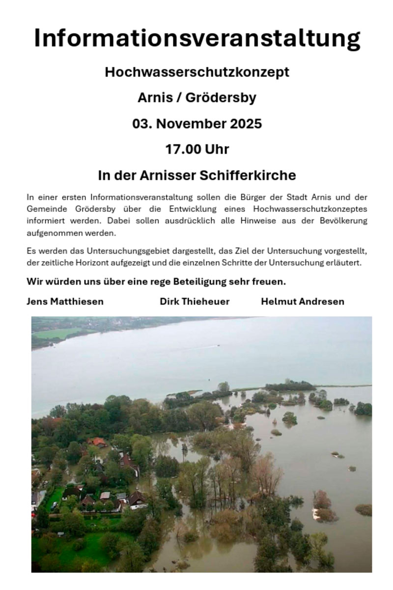 In einer ersten Informationsveranstaltung sollen die Bürger der Stadt Arnis und der Gemeinde Grödersby über die Entwicklung eines Hochwasserschutzkonzeptes informiert werden. Dabei sollen ausdrücklich alle Hinweise aus der Bevölkerung aufgenommen werden.